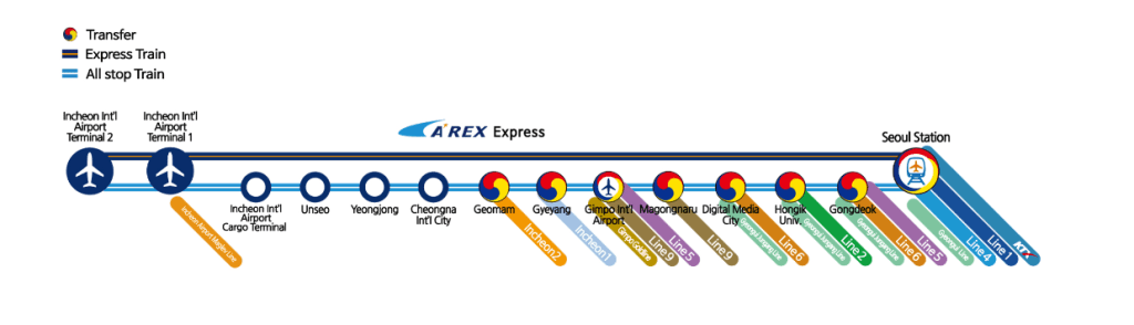 El Arex Airport Express conecta el aeropuerto con la estación central de Seúl en 55 minutos dependiendo de la terminal. El precio es de 11.000 KRW desde Seul Station y el tren te lleva directo. La opción que realiza todas las paradas tardas algo más, alrededor de 1h.15 -20 minutos, pero también es más barato (4.450 KRW). Tanto en el aeropuerto como en la estación de Seul Central sol debes seguir la indicación azul (AREX).