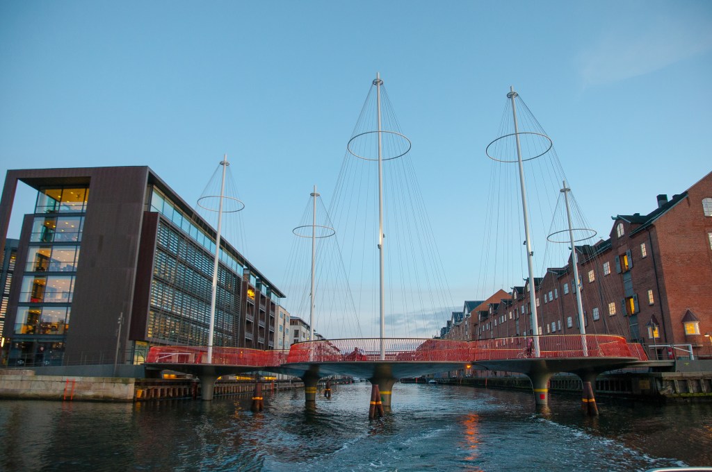 El Cirkelbroen o Puente Circular es el puente más espectacular de la capital. una original estructura formada por cinco plataformas redondas y cinco mástiles un guiño al pasado naviero de Dinamarca. El puente permite atravesar el Canal Christianshavn que conecta las zonas de Christiansbro y Applebys Plads.
